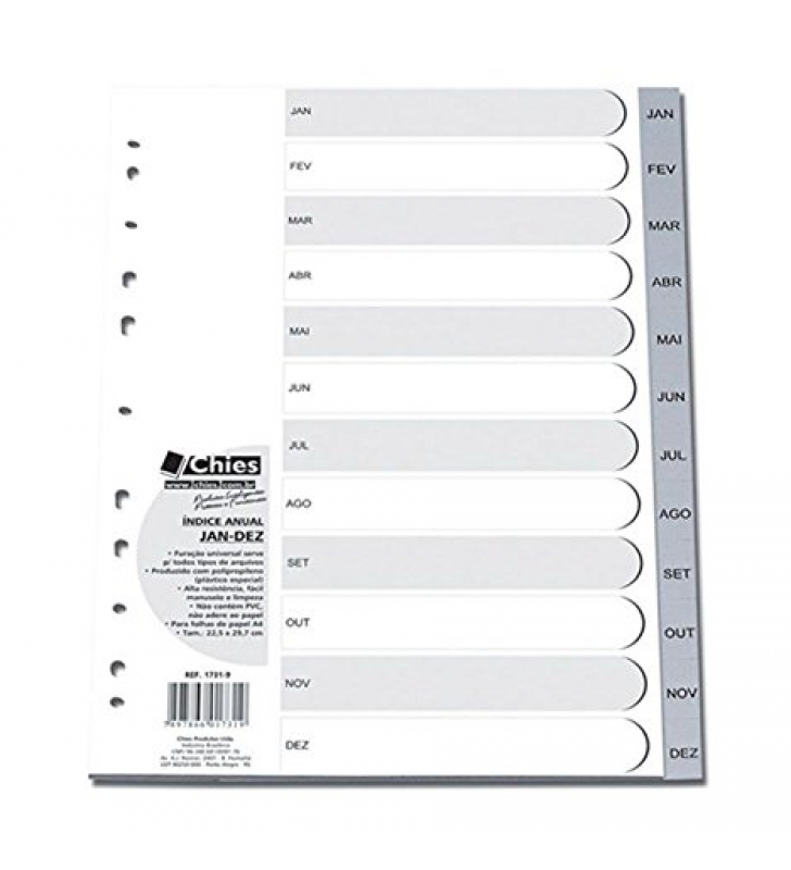 Organize seus documentos com o índice anual para pasta A4 da Chies. Com divisórias para os meses de janeiro a dezembro, este índice na cor cinza é ideal para pastas, mantendo seus arquivos organizados de forma prática e eficiente.