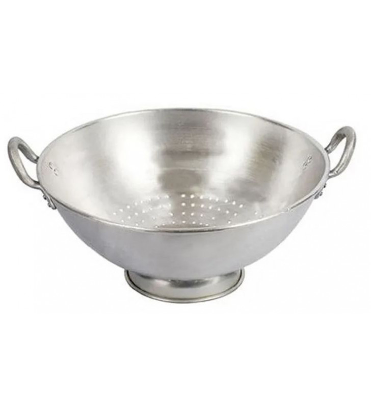 Escorredor de macarrão industrial em alumínio com 45cm de diâmetro. Este escorredor é perfeito para uso em cozinhas industriais, hotelaria e outras operações de grande escala. É feito de alumínio reforçado de alta qualidade e possui alças de alumínio.