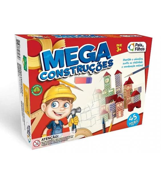 O jogo Mega Construções da Pais & Filhos é um brinquedo clássico que as crianças vão adorar! Apresenta 45 peças fabricadas em MDF feito a partir de madeira de reflorestamento, com formas e pinturas que simulam tijolinhos, telhados e janelas, possibilitando a montagem de diversas estruturas e permitindo que as crianças deem asas à imaginação.