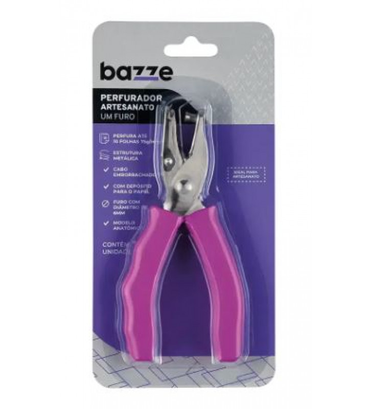 O perfurador de um furo Bazze é uma ferramenta projetada para fazer furos em papel, cartolina ou outros materiais finos. Sua capacidade permite a utilização de até 10 folhas ao mesmo tempo, de acordo com a gramatura.
