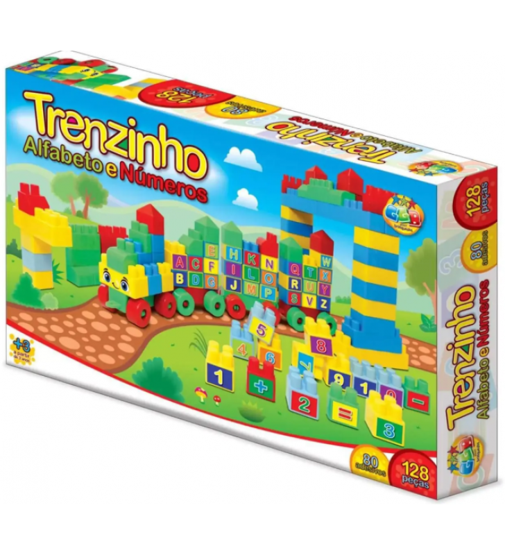 Trenzinho Alfabeto Números Blocos 128 Peças Ggb Plast 352 Hora de brincar, aprender e se divertir. Que tal montar um trenzinho, uma cidade, uma ponte, uma torre e o que mais a imaginação criar Este jogo tem peças coloridas e vem acompanhados de adesivos com letras e números, auxilia na coordenação motora, no aprendizado de letras e números, na formação de contas de soma e subtração, na formação de palavras, tudo com muita diversão.