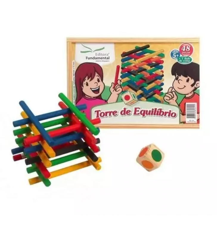 Torre de equilíbrio com dado cores 48 peças mdf Fundamental Brinquedos